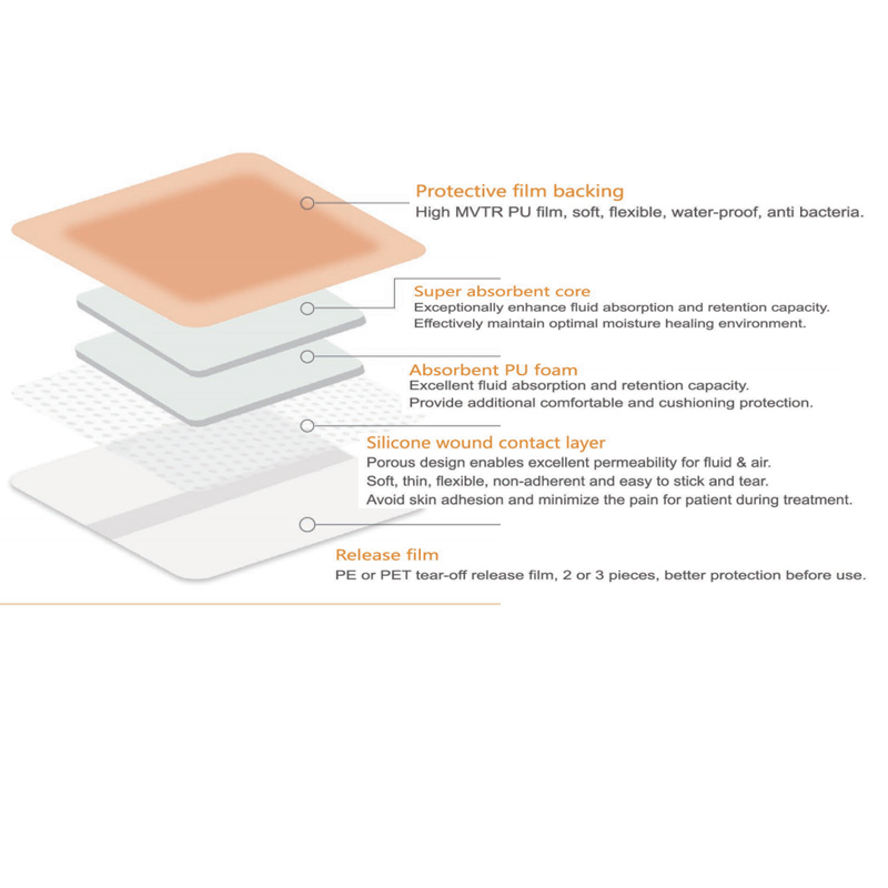 Ο επίδεσμος αφρού σλικόνης με περίγραμμα είναι ένας αυτοκόλλητος επίδεσμος με πρόσθετη περιμετρική άκρη που αποτελείται από προστατευτικό υπόστρωμα φλας, υπεραπορροφητικό πυρήνα, απορροφητικό αφρό PU, στρώμα επαφής πληγής σιϊκόνης και στρώση απελευθέρωσης.