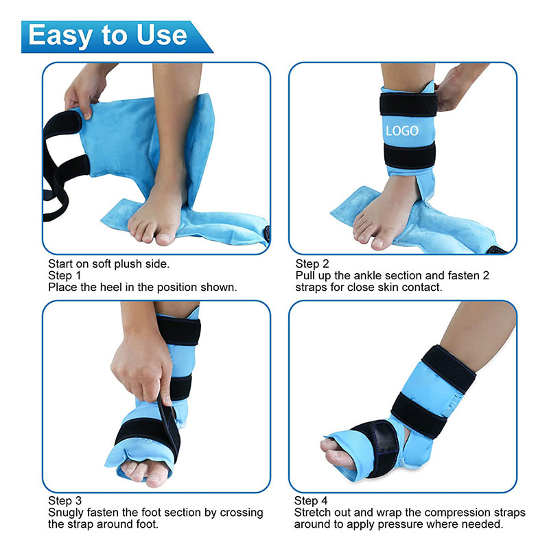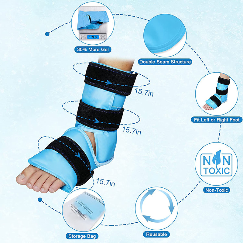 Η παγοκύστη διατίθεται με ελαστικούς ιμάντες νεοπρενίου που μπορούν εύκολα να προσαρμοστούν ώστε να εφαρμόζουν στους αστραγάλους και παρέχουν ισχυρή θεραπεία ψυχρής συμπίεσης για να έχετε το καταπραϋντικό αποτέλεσμα στον πόνο στον αστράγαλο, στον πόνο στα πόδια και στον πόνο στη φτέρνα.