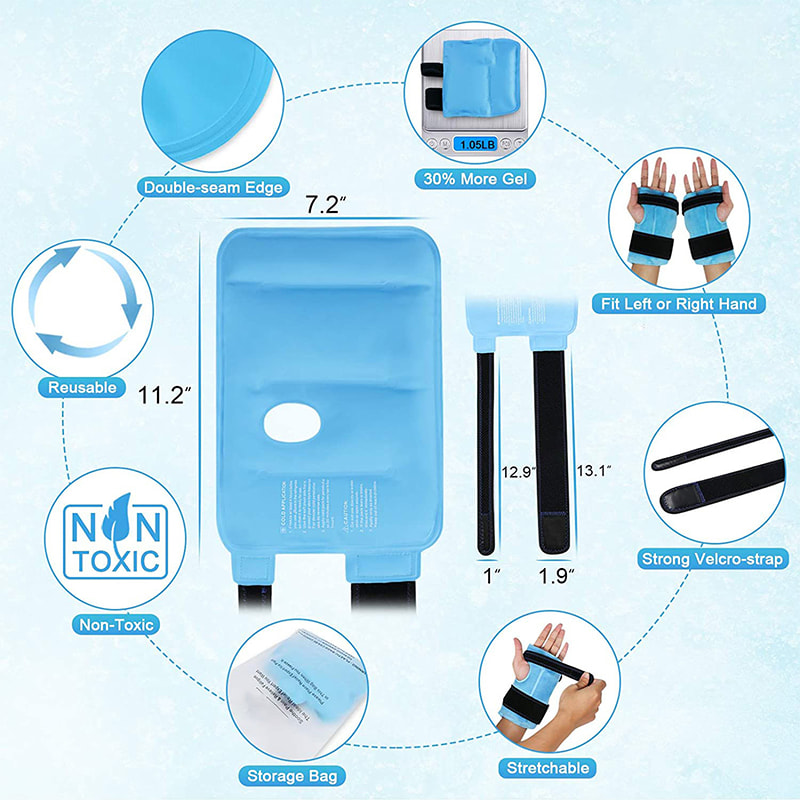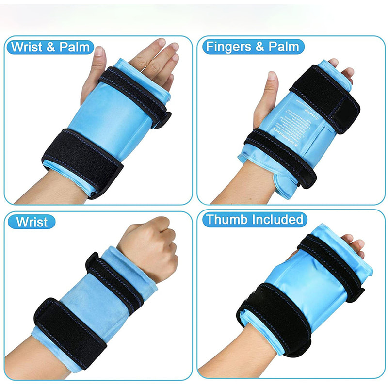 Κάντε μια ψυχρή συμπίεση με τον ελαστικό ιμάντα για να τυλίξετε τον τραυματισμένο καρπό για να επιταχύνετε την ανάρρωση από το σύνδρομο καρπιαίου σωλήνα και την μετεγχειρητική ανάρρωση, να μειώσετε τους μώλωπες και το πρήξιμο που σχετίζονται με αθλητικούς τραυματισμούς και να ανακουφίσετε τους χρόνιους πόνους στις αρθρώσεις. Υπάρχουν 4 μέθοδοι χρήσης της παγοκύστης, στοχευμένες στα δάχτυλα και τον καρπό. Για την αποφυγή διαρροής γέλης, το περιτύλιγμα πάγου καρπού εφαρμόζει τεχνολογία διπλής ραφής για να σφραγίσει την άκρη της παγοκύστης.