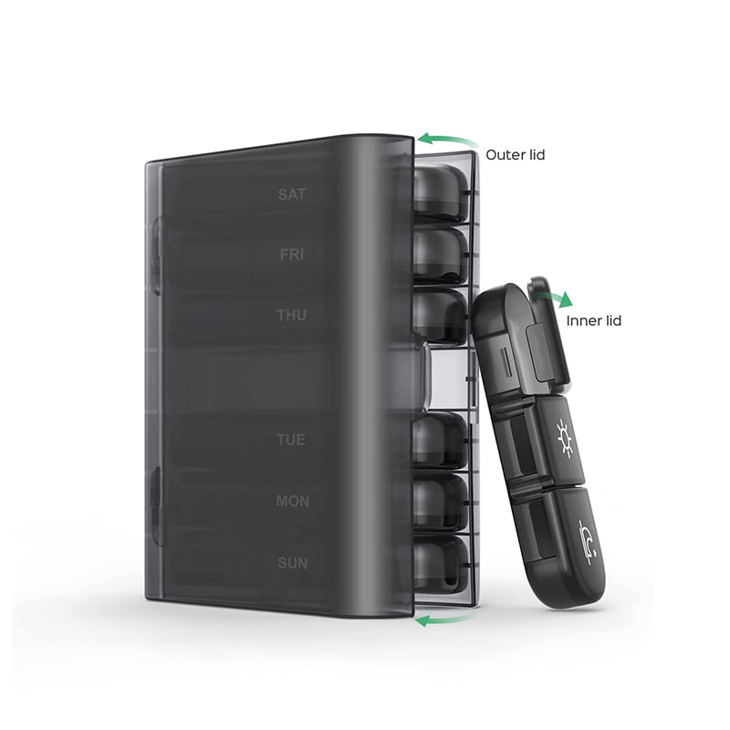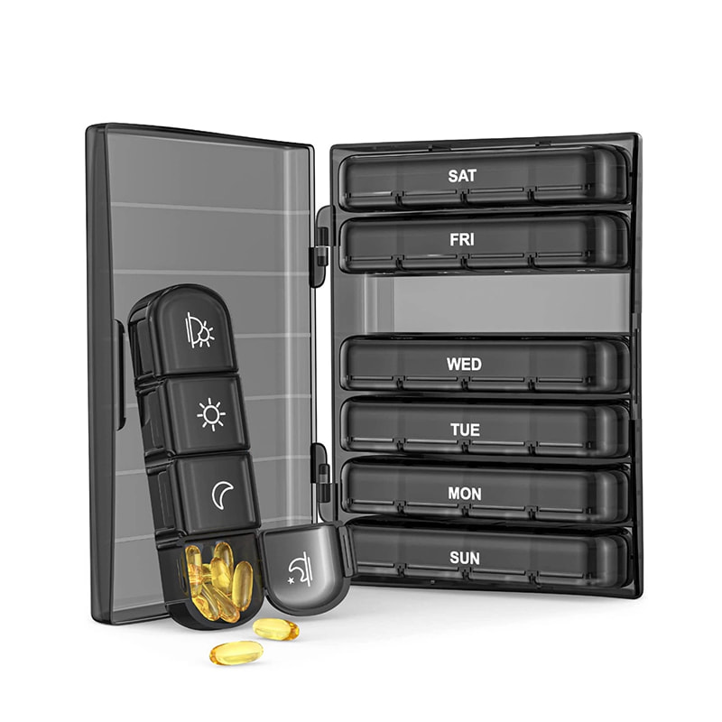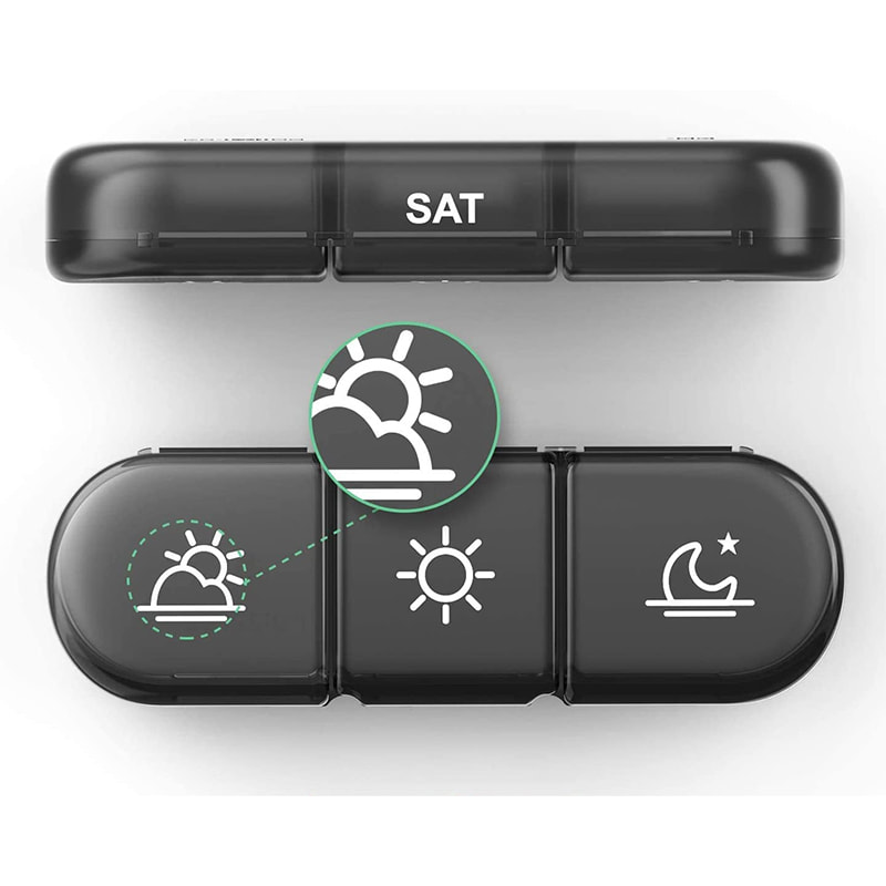 Το μεγαλύτερο μαύρο κέλυφος μπορεί να φιλοξενήσει 7 ανεξάρτητους οργανωτή κουτιών χαπιών για να προγραμματίσετε τα χάπια για μια εβδομάδα.