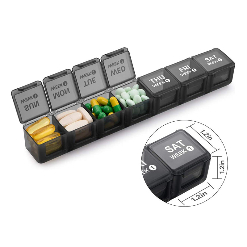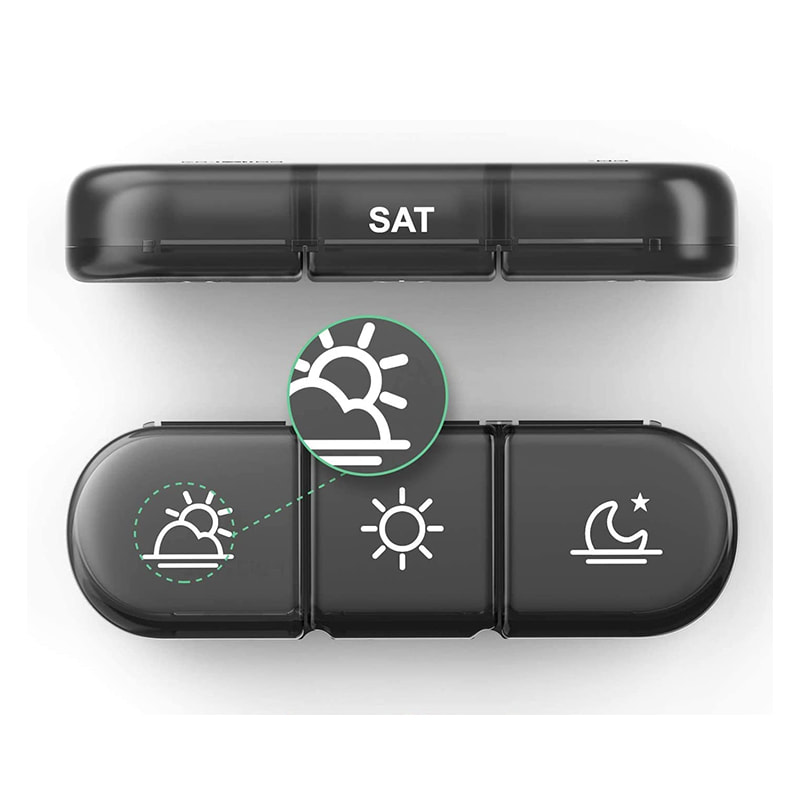 Τα καθημερινά κουτιά χαπιών είναι κατασκευασμένα από πλαστικό PP για τρόφιμα, ενώ το εξωτερικό δοχείο είναι κατασκευασμένο από πλαστικό ABS, χωρίς BPA και ασφαλές για ιατρική χρήση.