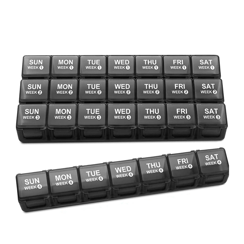 Το κουτί χαπιών μας έχει τέσσερα δοχεία χαπιών μιας εβδομάδας, μπορεί να κρατήσει οργανωμένο το φάρμακό σας ενός μήνα και θα είναι σε καλό δρόμο για τη διατήρηση της φαρμακευτικής σας αγωγής AM/PM.