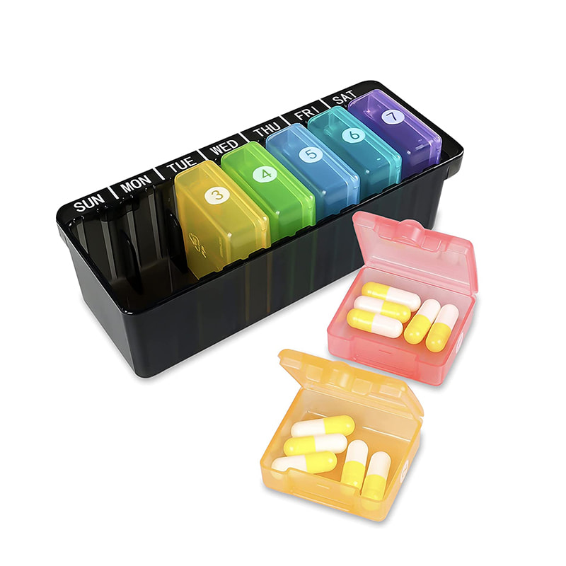 7 ατομικά πολύχρωμα κουτιά χαπιών σας επιτρέπουν να πάρετε αυτό που χρειάζεστε για την ημέρα και να το τοποθετήσετε στην τσάντα ή την τσέπη σας.