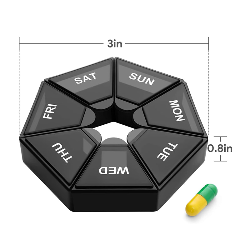 Η διάμετρος των 4 ιντσών είναι μεγαλύτερη από άλλα κουτιά χαπιών 7 όψεων, αρκετά μεγάλη για να αποθηκεύει περισσότερα καθημερινά χάπια.