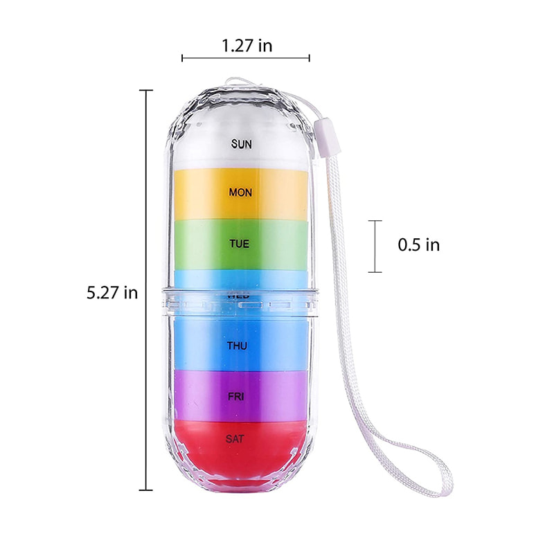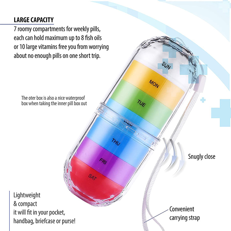 1 εξωτερικό δοχείο με ιμάντα και μεμονωμένες θήκες 7 ημερών για την αποφυγή τυχαίας έκχυσης και τη διατήρηση του φαρμάκου ασφαλή, στεγνό και μακριά από υγρασία. δεν ανοίγει αυτόματα όταν πατηθεί. Το σχοινί που είναι προσαρτημένο στο κιτ καθιστά εύκολη τη μεταφορά του.