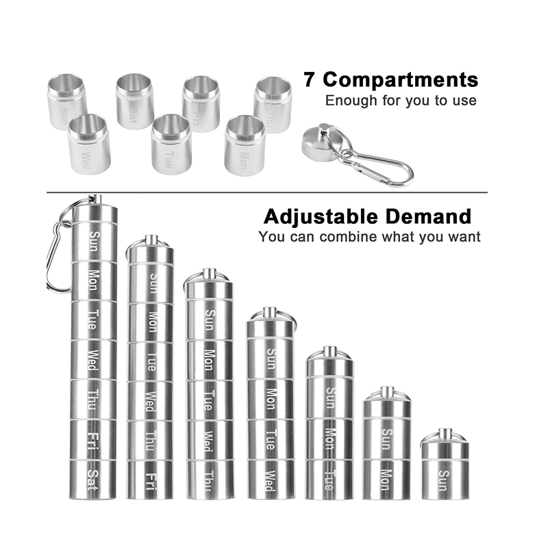 Το εβδομαδιαίο κουτί χαπιών έχει σχεδιαστεί με 7 διαμερίσματα, σας επιτρέπει να βάλετε τη δόση των δισκίων που θέλετε σε κάθε διαμέρισμα, επιπλέον, το μήκος μπορεί να προσαρμοστεί ανάλογα με τις δικές σας ανάγκες