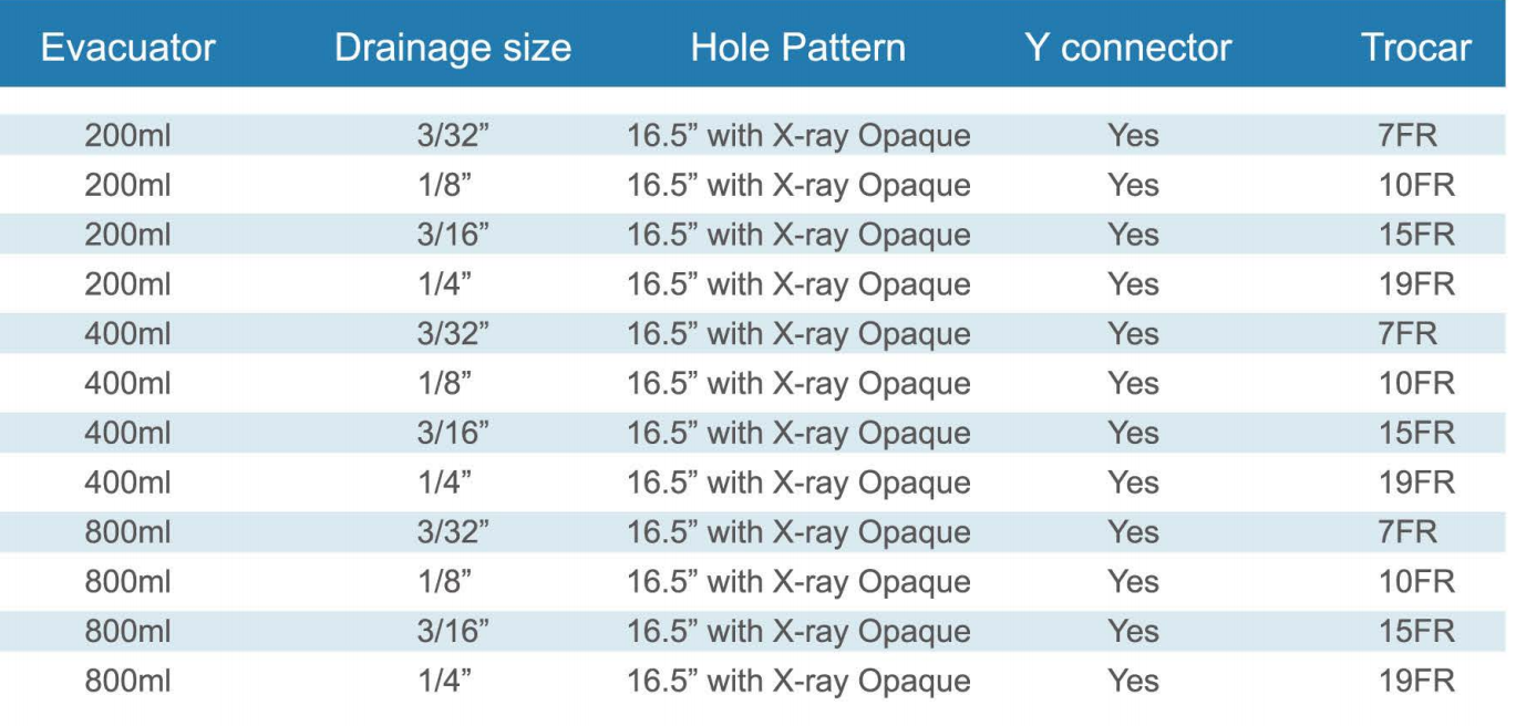 * Το κλειστό μας σύστημα αποστράγγισης πληγών, συμπεριλαμβανομένου του εκκενωτή ελατηρίου 400cc3,·σωλήνωσης PVC και συνδετήρα «Y» και αποστράγγιση με τροκάρ.